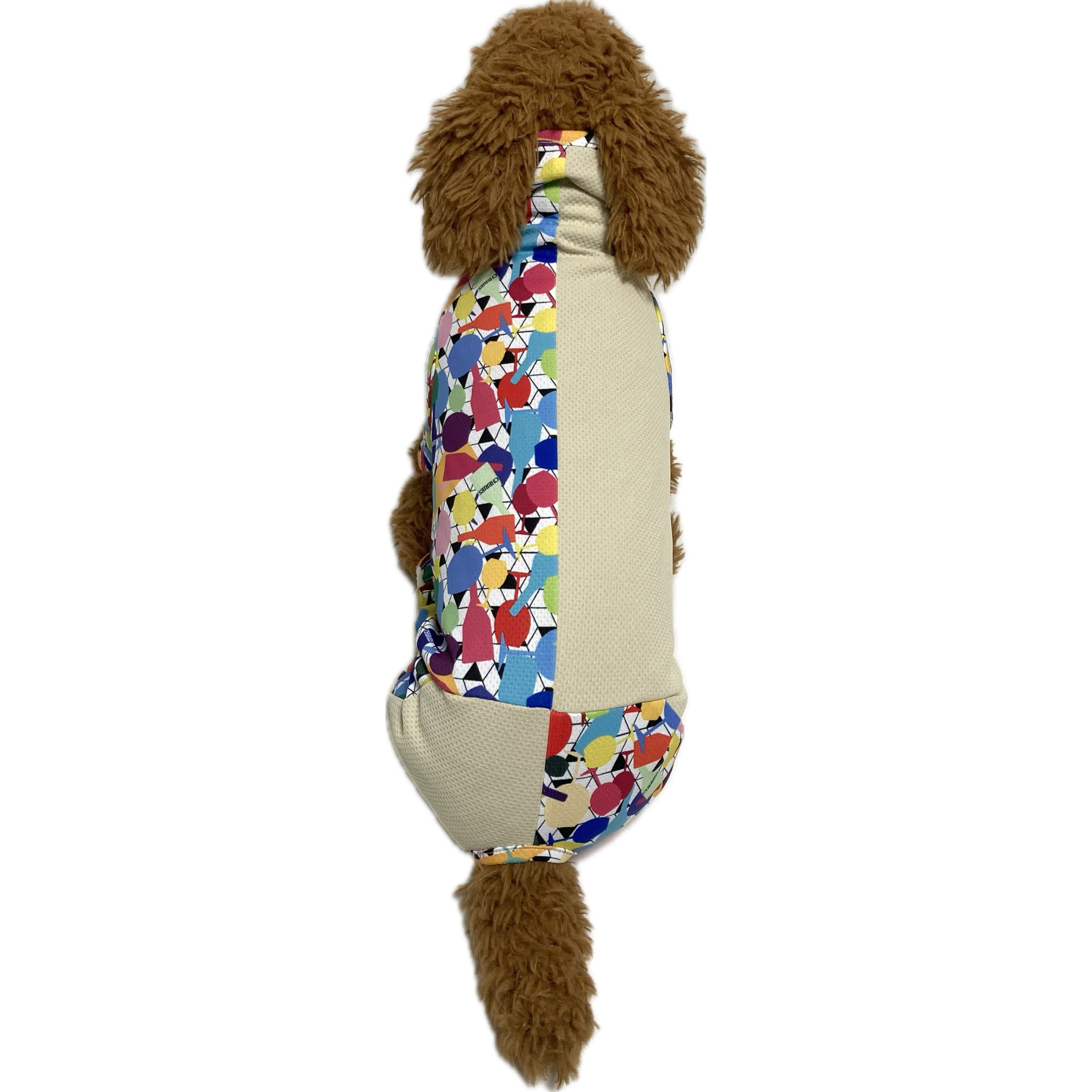 吸放湿・吸水水拡散性のある素材なので,濡らして(絞ってから)着せることで水分の気化熱を利用してクーリング効果を得ることもできる優れものです。暑さ対策として,着せることで逆に涼しく過ごすこともできるウェアです。ワンちゃんにとってとても快適な一着となっています。