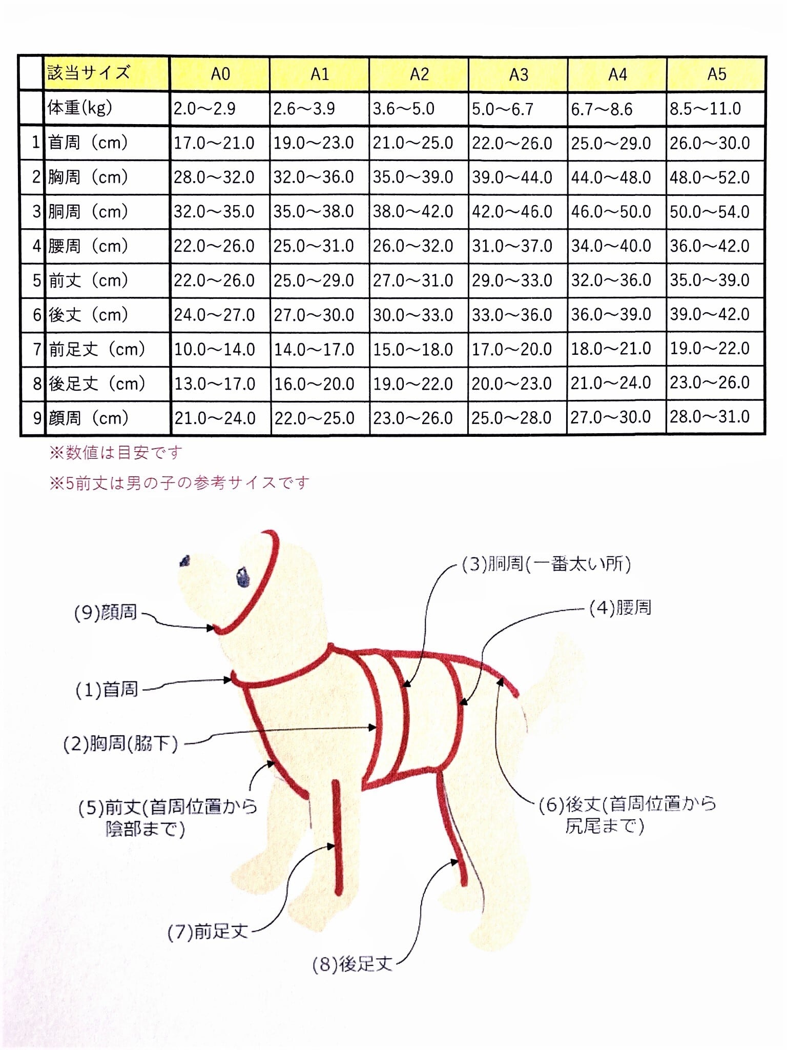 A5:32.0cm(首回り)/56.0cm(胴回り)/38.0cm(後丈)*後丈=首回りから背中に沿って尻尾の付け根まで