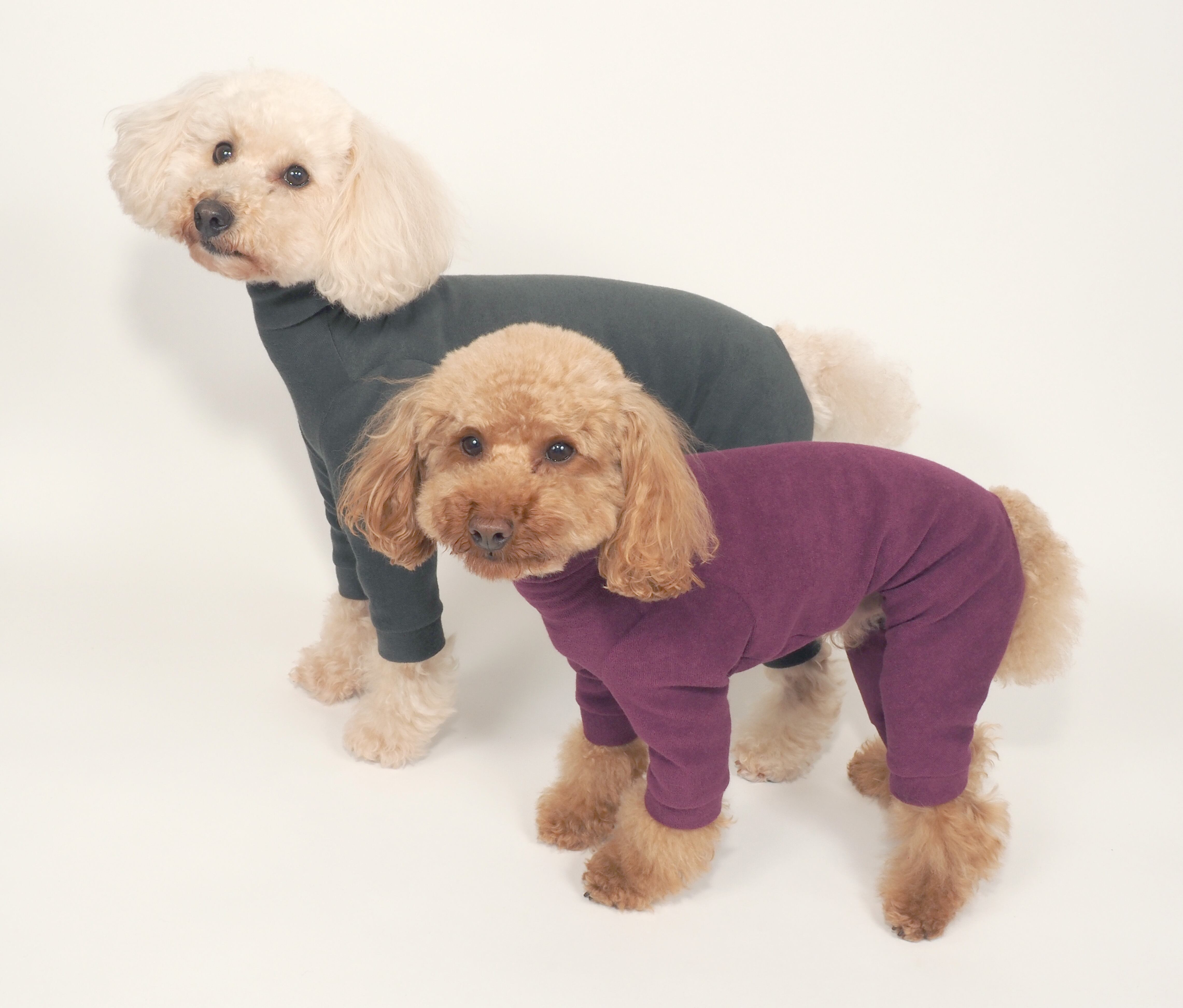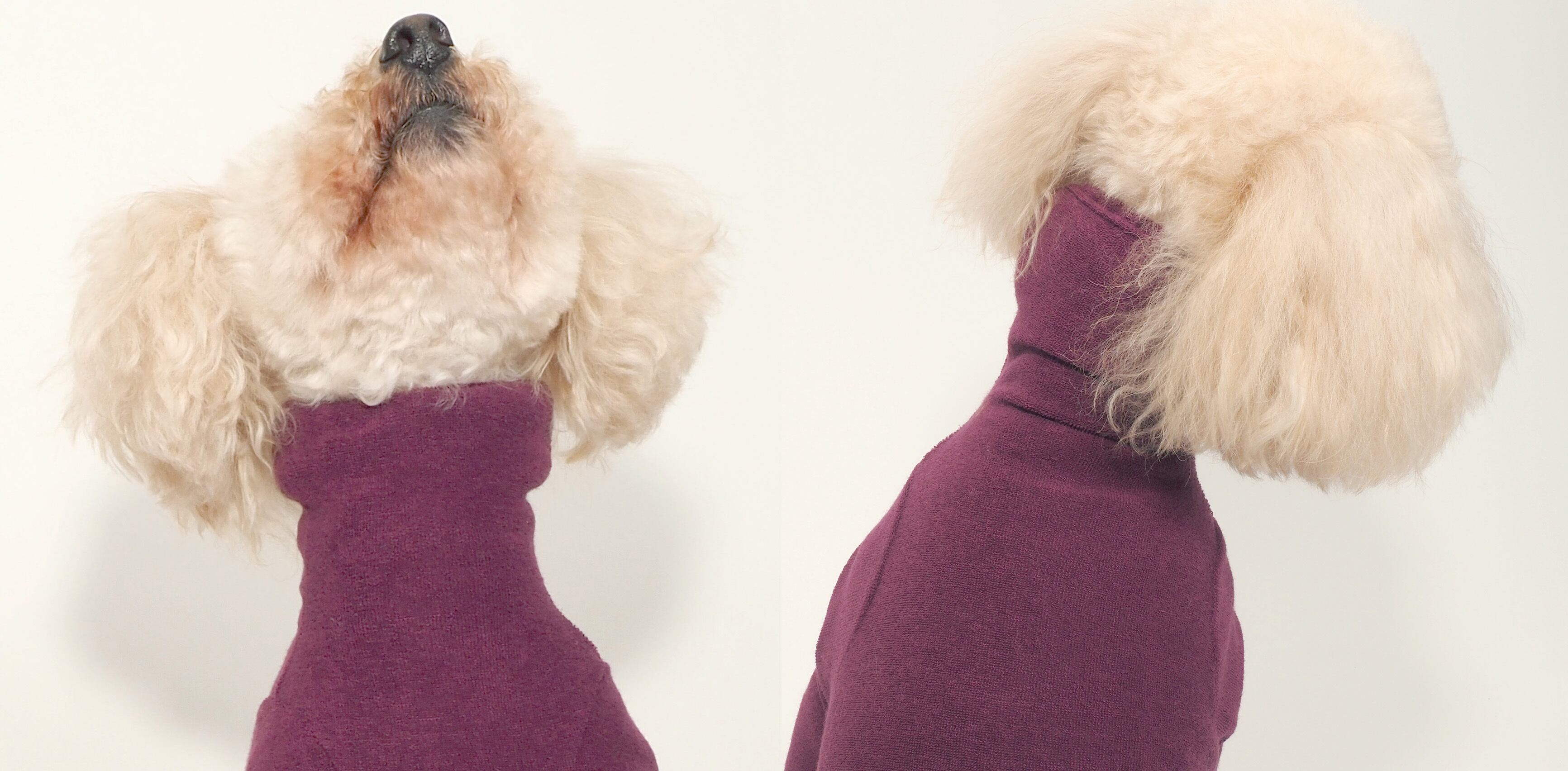 ワンちゃんのお洋服では珍しいボトルネックが特徴的でお洒落(意匠権取得)首の長いトイプードルさんにジャストフィット。暖かくて、着心地満点、室内着としてはもちろんのこと、肌寒い日のお出かけでも重宝します。インナーとしてアウターとの重ね着もお勧めです。