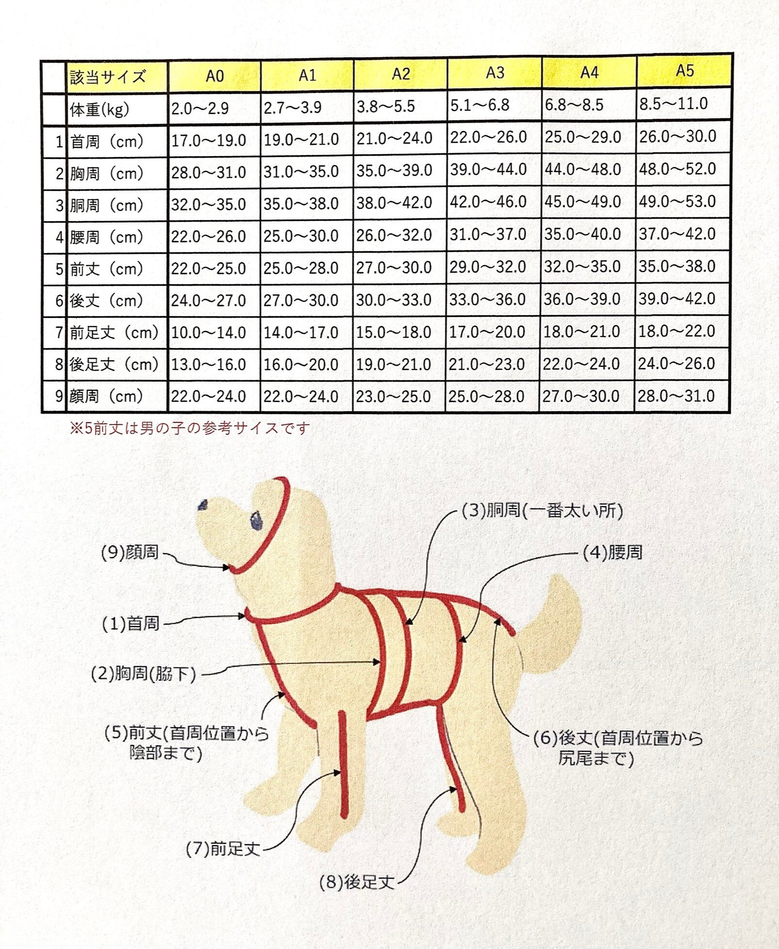 A5:32.0cm(首回り)/56.0cm(胴回り)/38.0cm(後丈)*後丈=首回りから背中に沿って尻尾の付け根まで