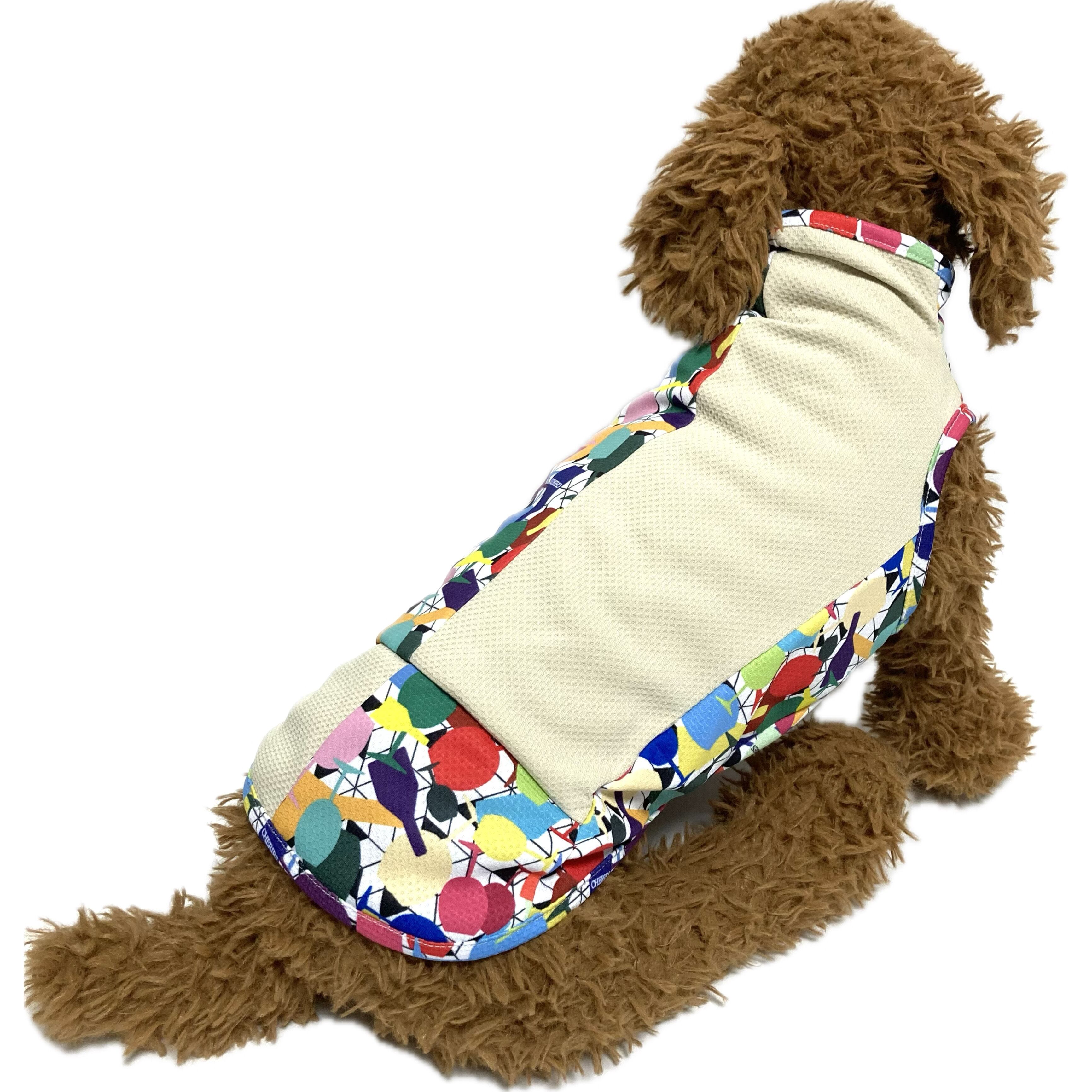 吸放湿・吸水水拡散性のある素材なので,濡らして(絞ってから)着せることで水分の気化熱を利用してクーリング効果を得ることもできる優れものです。暑さ対策として,着せることで逆に涼しく過ごすこともできるウェアです。ワンちゃんにとってとても快適な一着となっています。